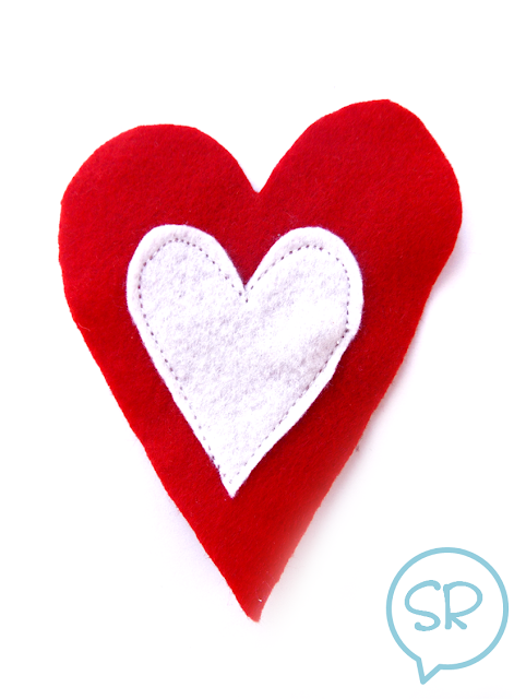 Ritagliate la sagoma grande del cuore nel pannolenci rosso e quella piccola nel bianco e cucitele insieme.